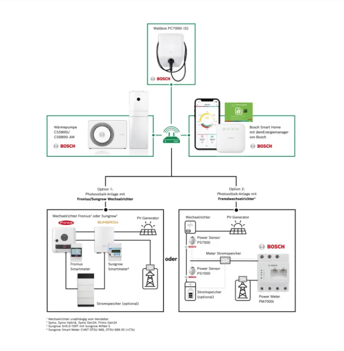 Voraussetzung für den Energiemanager im Bosch Smart Home ist eine Wärmepumpe und eine Photovoltaik Anlage mit einem Fronius Symo Wechselrichter oder einem Sungrow Wechselrichter oder einem Bosch Power Meter, die beide mit dem Internet-Router verbunden sind.